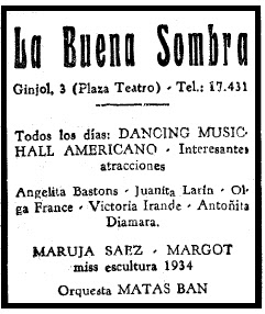 Un dels locals nocturns de més longevitat de la ciutat fou La Buena Sombra, situat al carrer Gínjol número 3 tocant a la Plaça del Teatre. Fundat per l'empresari Francisco Buxó i construit per l'arquitecte municipal Andreu Audet, especialista en locals d'espectacles, la història d'aquest establiment es remunta als inicis dels 1880's amb el nom de Cafè Sevillano. El 1886 passa a anomenar-se Alcázar Français i el maig de 1888 reobre com a Palais de Cristal. Al llarg de la seva dilatada existència va canviar encara diverses vegades de nom (era Cabaret Sport el 1918), però, sens dubte, va ser sota la denominació de La Buena Sombra -nom que ja tenia el 1910- quan va adquirir una major celebritat entre els amics de la nit de començaments de segle. Va ser també un local típic de flamec on van començar a ballar artistes després consagrades com Raquel Meller o La Niña de los Peines. Amb l'Exposició Universal de 1929 el cabaret va recobrar una més gran notorietat gràcies a l'empenta del seu nou empresari Pier Porta, que l'havia adquirit el 1924, i va reformar-lo a fons, ampliant i redecorant la sala de ball després de reduir l'espai anteriorment dedicat a escenari.