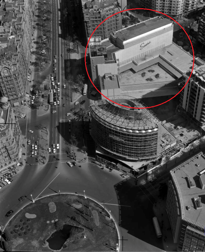 *1968.- Vista a vol d'ocell dels magatzems Sears poc després d'inaugurar-se. Davant veiem l'edifici Winterthur encara en construcció. (Foto: Institut Cartogràfic de Catalunya)